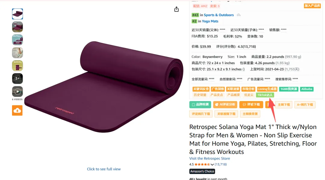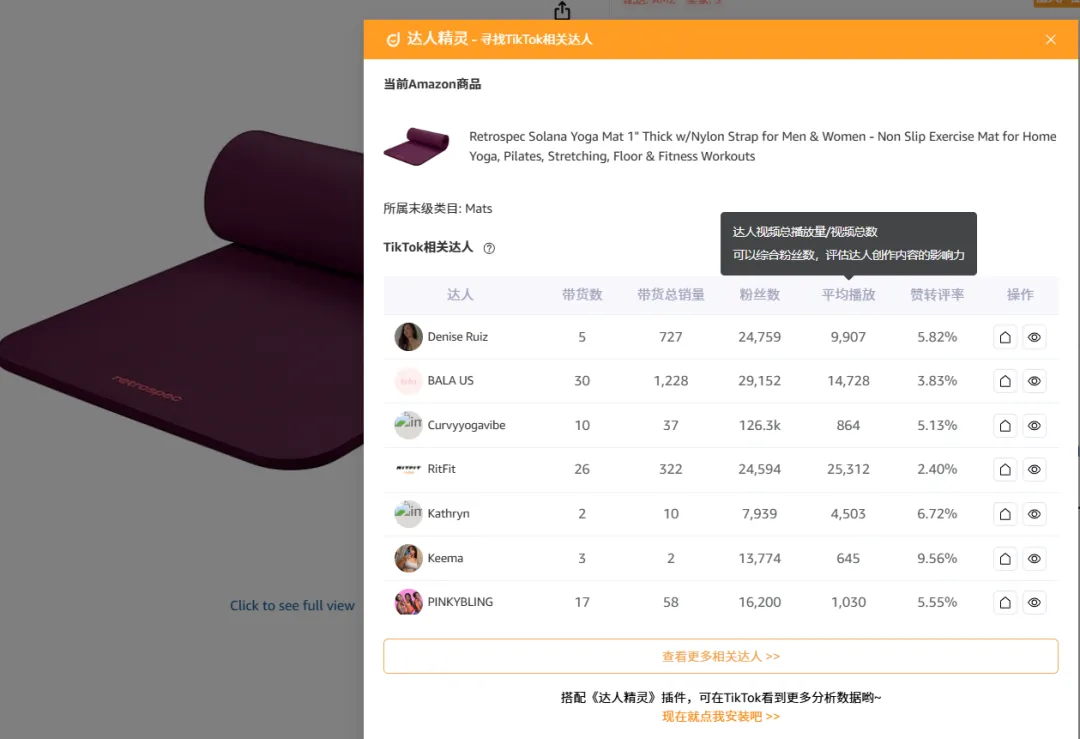 当然这里面有一个有些卖家可能会遇到的问题,就是自己在tiktok上拍摄的视频效果不一定好,对自己没信心,这个时候不妨可以考虑找一些在tiktok上带货同类产品的达人、比如你卖瑜伽垫的,你装上卖家精灵插件,listing详情页点击“tiktok”达人;