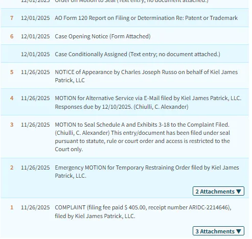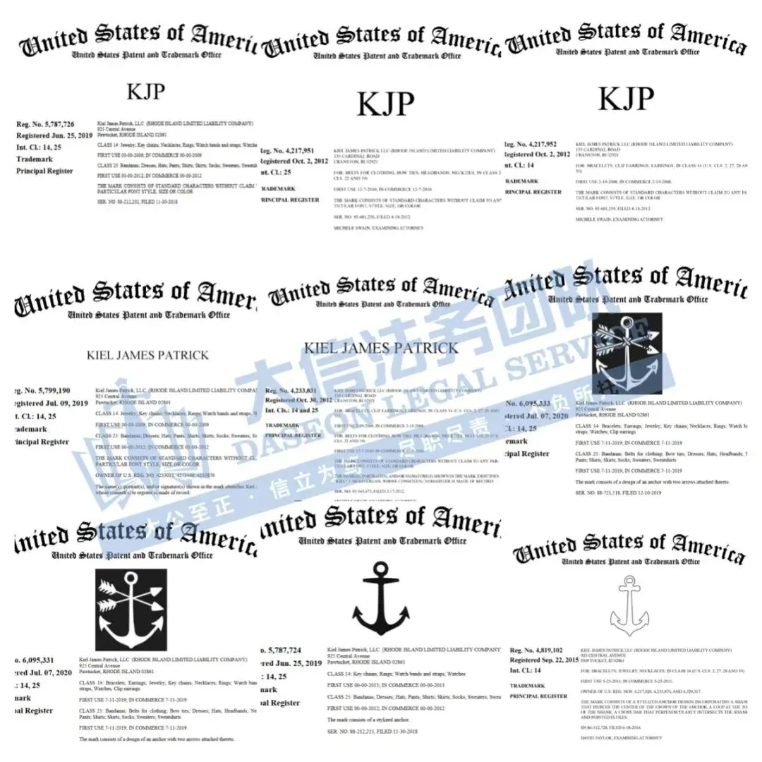 此案为商标维权,目前已有16家店铺被冻结,商标关键词:KJP、kiel james patrick以及多种船锚图形商标,侵权风险极高!以下是维权具体信息,未经授权不得擅自使用,跨境卖家尽快检索下架,否则会有TRO侵权风险!