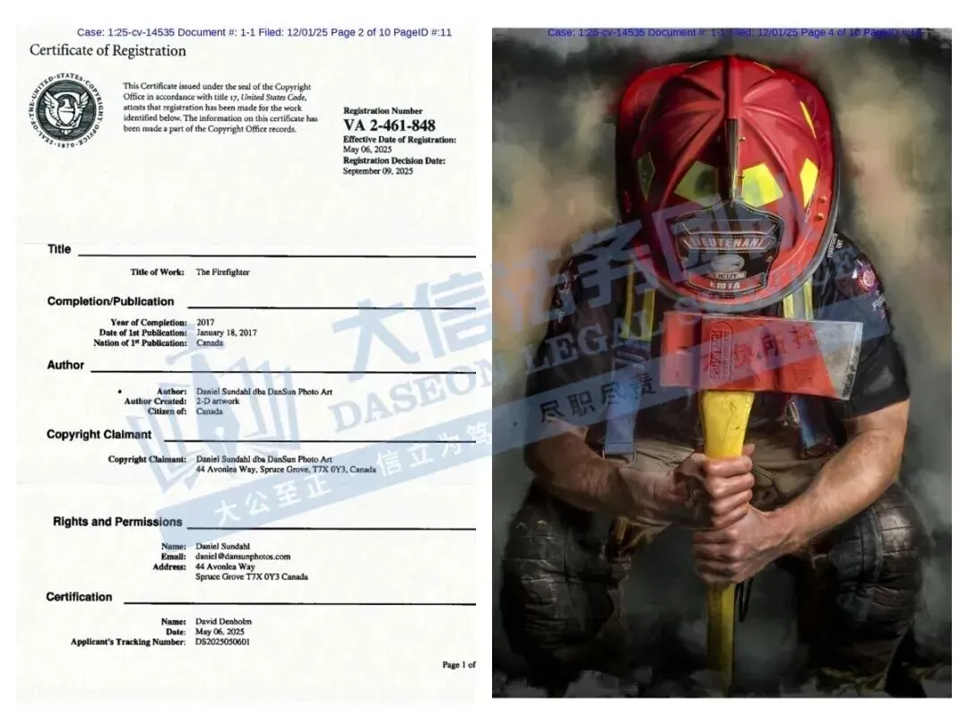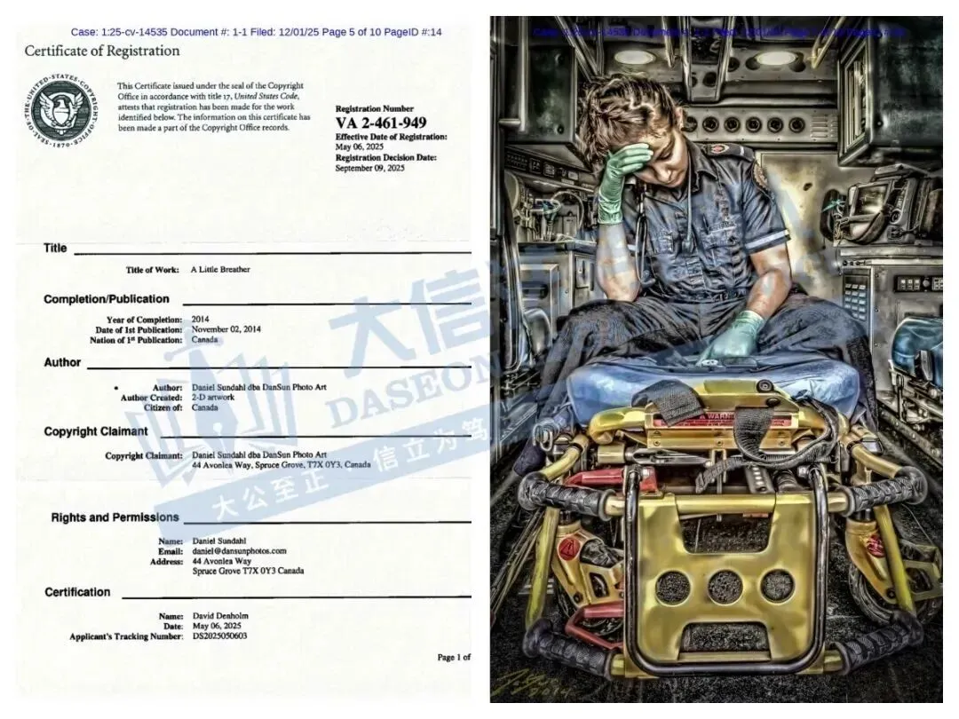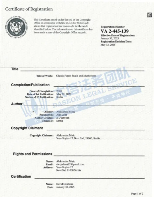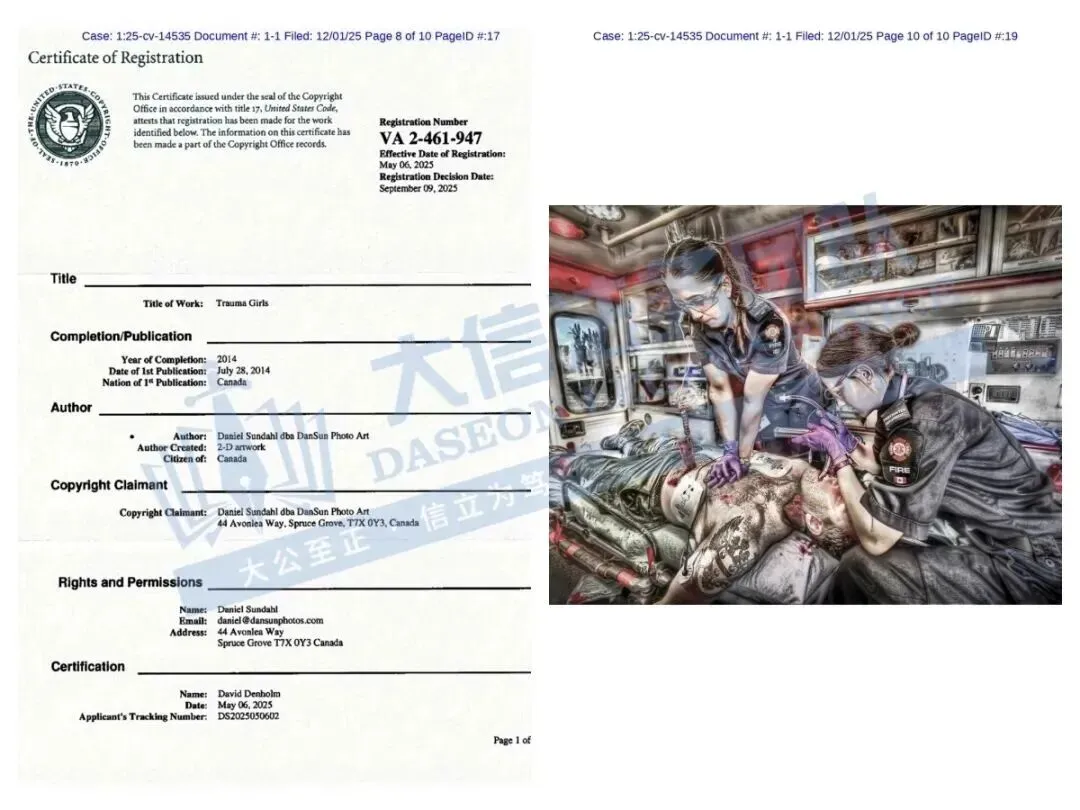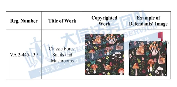 此案为版权维权,共涉及3张作品,版权号:VA 2-461-848、VA 2-461-949和VA 2-461-947,下证日期为2025年5月6日,均于2025年5月6日下证,以下是维权具体信息,未经授权不得擅自使用,跨境卖家尽快检索下架,否则会有TRO侵权风险!