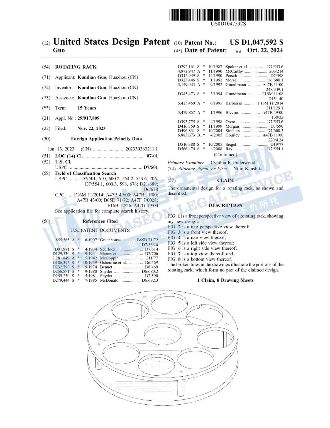 此案为Rotating rack旋转置物架的专利维权,专利号:D1047592。于2024年10月22日获得美国外观专利认证,侵权风险极高!以下是维权具体信息,未经授权不得擅自使用,跨境卖家尽快检索下架,否则会有TRO侵权风险!