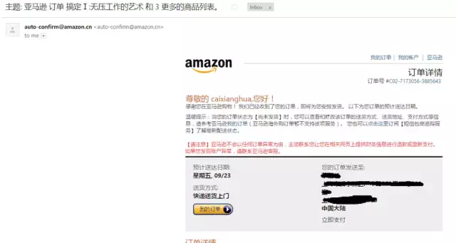 特地留意了邮件头,发现的的确确是amazon发出来的,但是注意,这只是一封确认邮件!