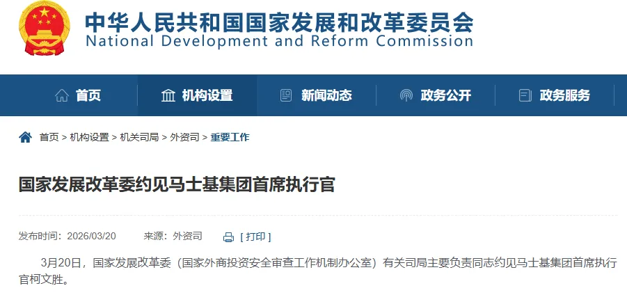 3月20日,国家发展委(国家外商投资安全审查工作机制办公室)。约见了马士基集团首席执行官(CEO)柯文胜(VincentClerc)。