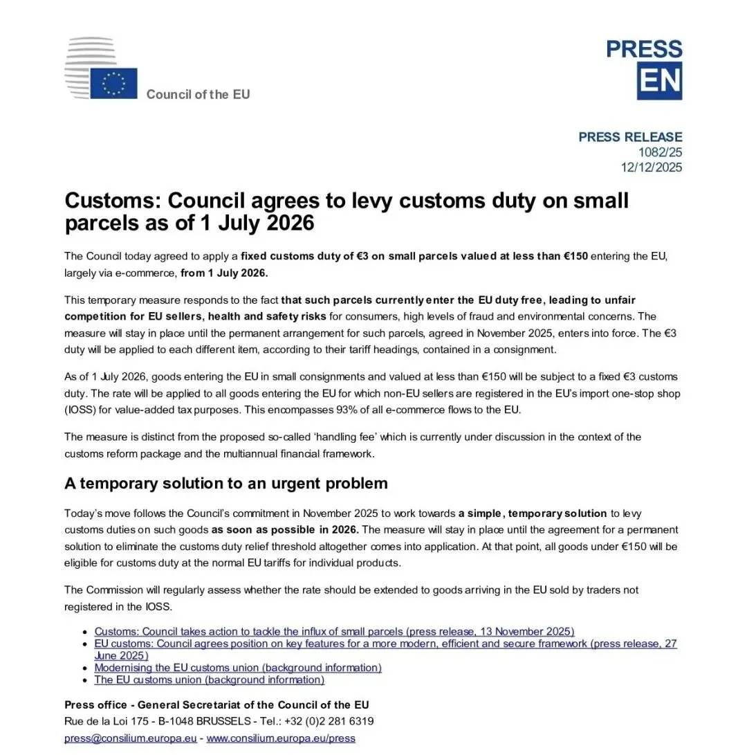 刚刚,欧盟宣布对中国进口小包裹加征关税,2026年7月1日生效