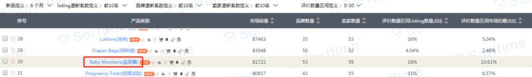 选品软件我们用的是Sorftime。打开Sorftime美国站,选定Baby大类,先在市场看板模块设定几个参数:新品定义6个月(1或3个月也可),Listing垄断系数、品牌垄断、卖家垄断都定义前十名,评价数量定义0-30个。市场容量降序排列: