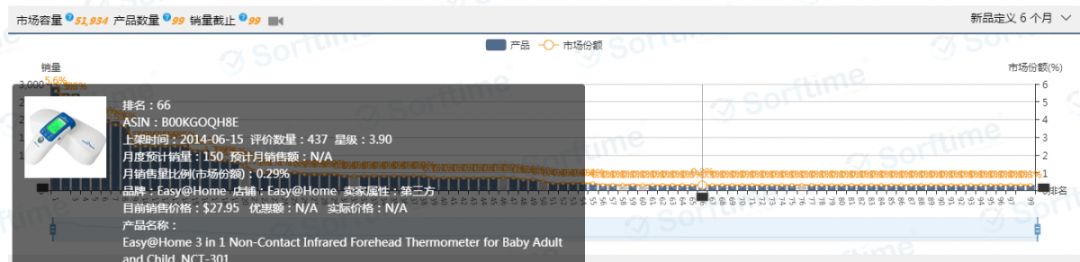 另有些类目垄断情况也较为严重,例如Baby类目下面的体温计(图五),单看市场容量是不错的。新品也有机会冲进TOP100(灰色柱子代表上架6个月以内的新品),但是我们通过软件看到,TOP50-100销量基本没有起伏,都是150单左右。销量主要集中在几个头部卖家。