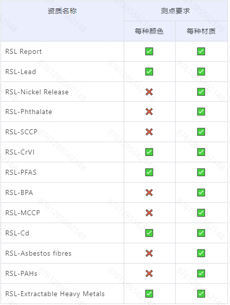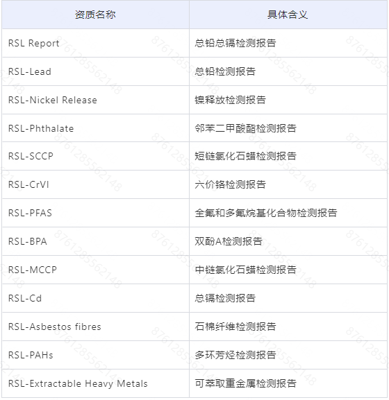 RSL资质是指一系列RSL资质的简称,其中包括RSL report、RSL-Lead、RSL-Nickel Release、RSL-Phthalate、RSL-SCCP等。此类资质的要求是由专业第三方检测机构检测并出具的、含有指定的化学检测项目结果的、证明产品符合REACH、POPs等法规要求的检测报告。各资质对应的化学检测项目详见如下表格:
