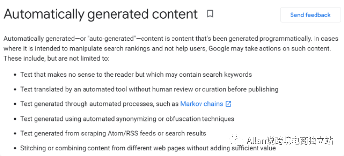 从这个政策我们可以看出,内容的来源本身不是问题。问题是自动生成的内容很少有足够的质量,并且经常被用来操纵搜索算法。但是,如果你设法创建了连贯的、内容丰富的副本,谷歌就没有理由惩罚它。