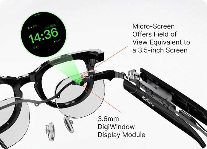 Halliday智能眼镜采用全球最小的近眼显示模块“DigiWindow”,在右上角无缝投射3.5英寸虚拟屏幕,确保隐私且不影响视野。其主动式AI助手可分析对话,提供实时建议,支持40种语言的实时翻译、导航、语音转文字笔记等功能。用户可通过语音、镜架触控或配套的触控戒指进行控制。眼镜重量仅35克,电池续航达12小时,支持更换处方镜片,设计经典时尚,提供哑光黑、玳瑁色和渐变色三种镜框选择。