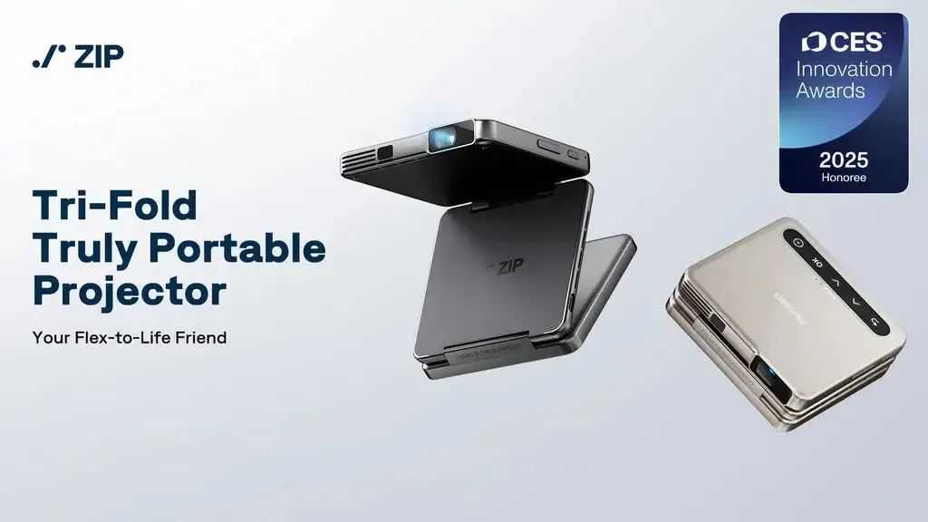 Aurzen ZIP是全球首款三折叠便携投影仪,采用创新设计,厚度仅1英寸,重量约280克,提供极致便携性。其内置可调支架支持精确调整投影角度,无需外部支撑。Aurzen ZIP无需Wi-Fi即可一键实现屏幕镜像,兼容多种设备,且采用先进的ToF自动对焦技术,提供零延迟的清晰画面。内置5000mAh电池支持最长1.5小时使用,并支持24W快充。投影仪支持竖屏显示,适合社交媒体内容。技术参数上,采用8毫米高清光学引擎,分辨率720p,亮度100 ANSI流明,支持4K播放,适合移动办公和户外使用。