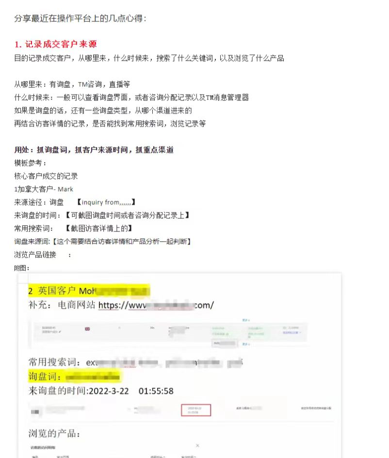 一般来了询盘,或者TM,我会结合下访客详情做下记录,类似模板:分享最近在操作平台上的几点心得