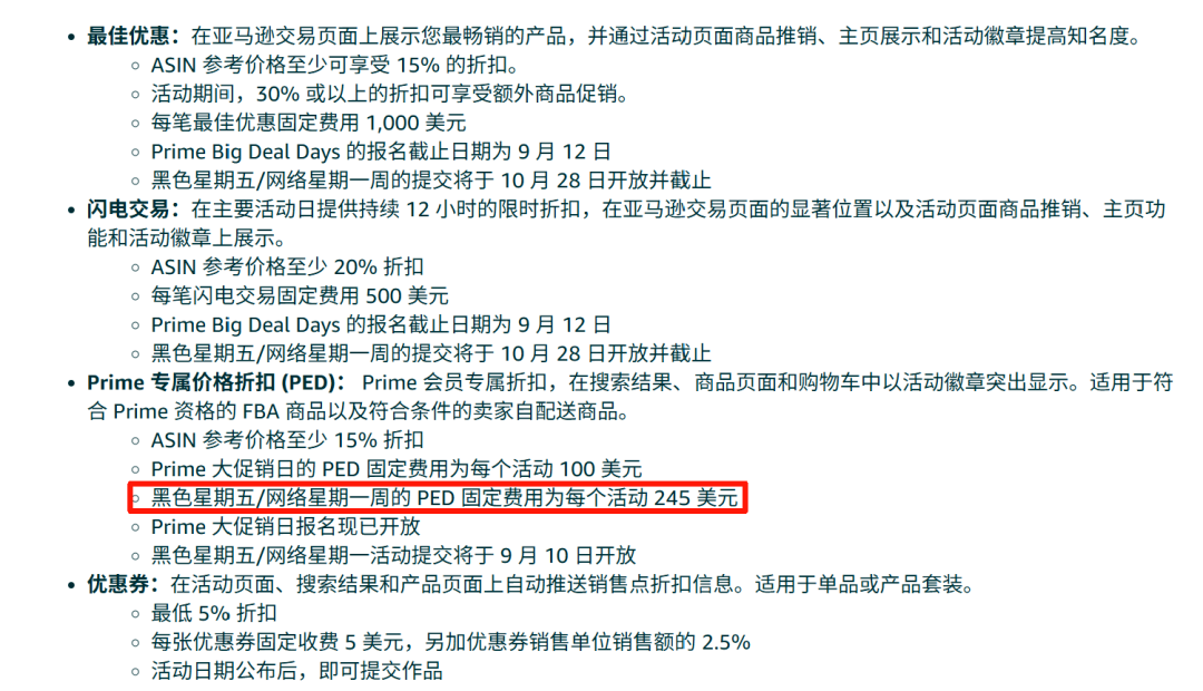 黑五网一报名费涨至 245 美元/场,折扣需≥15%,库存不足费用不退。同一父ASIN 的变体可共享报名费,降低成本。