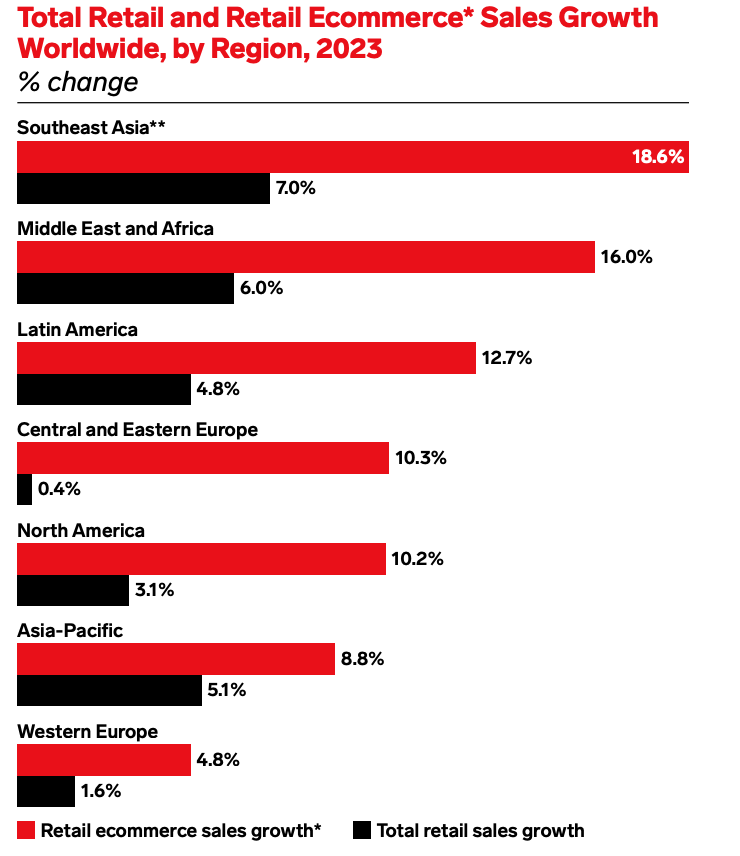 根据市场研究公司eMarketer发布的《2023年全球零售电商预测报告》,其2023年电商销售额预计增长18.6%,远超全球其他电商市场。