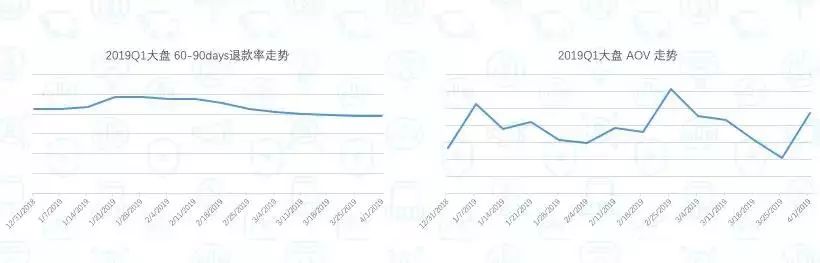 2019年第一季度大盘退款率表现良好,60-90天平均退款率平缓下降,表现好于2018 年第四季度。