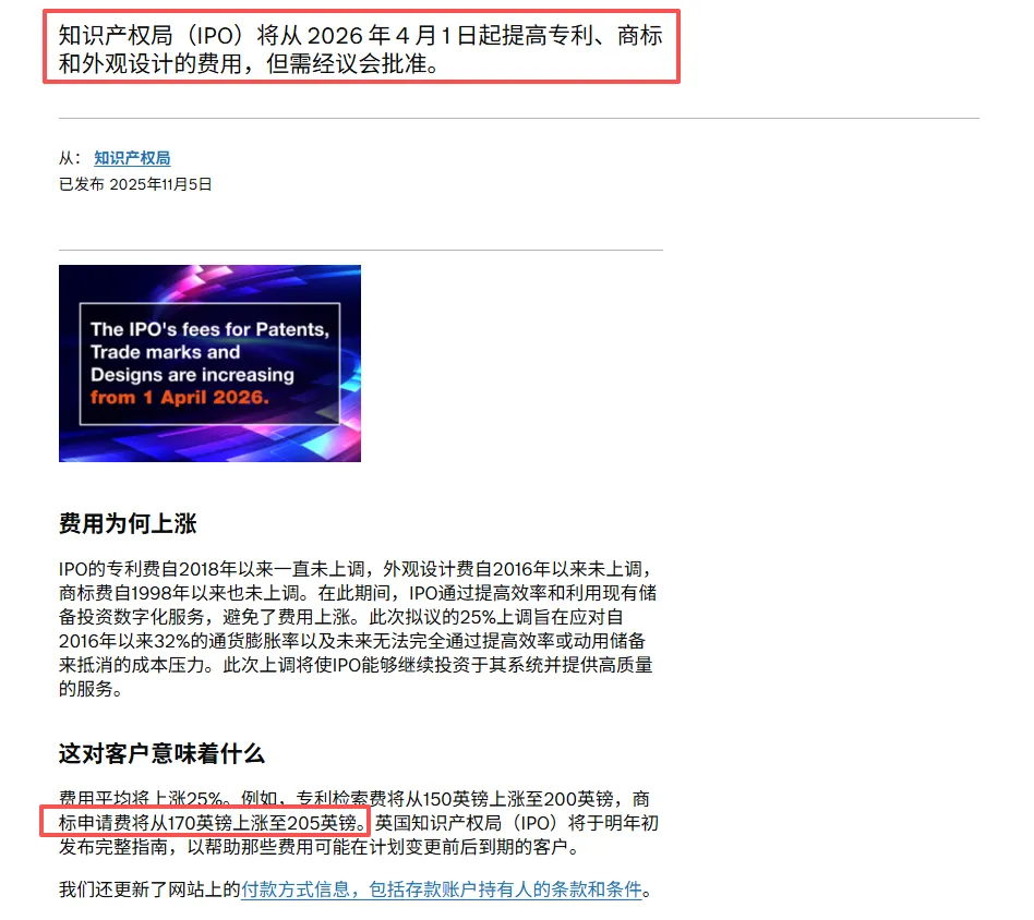 ◆费用全面上调25%:英国知识产权注册成本整体上升。