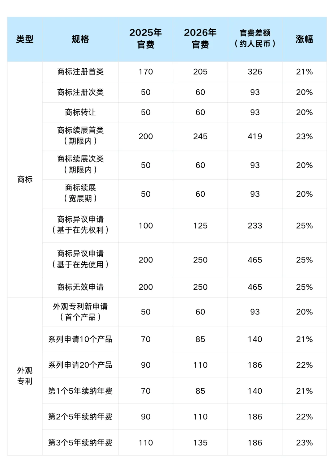 商标首类注册费从£170涨至£205,涨幅约21%;外观专利新注册从£50涨至£60,涨幅20%;部分续展及异议程序费上调幅度最高达25%;整体来看,英国知识产权注册成本将全面上升。