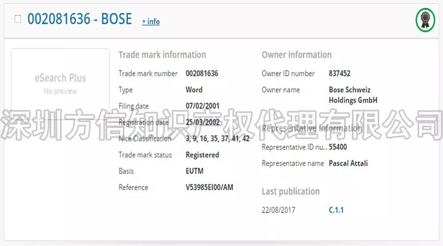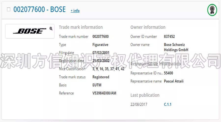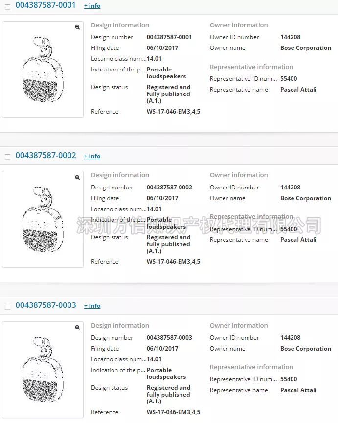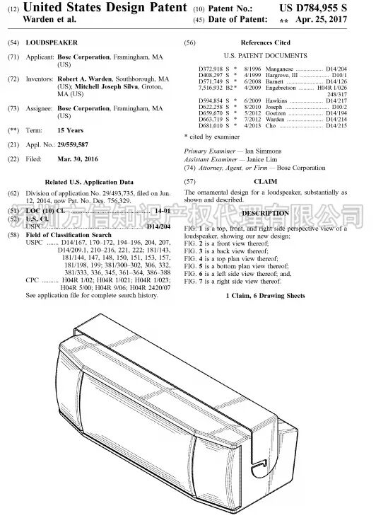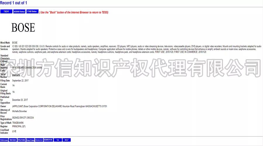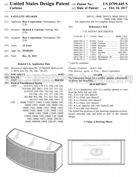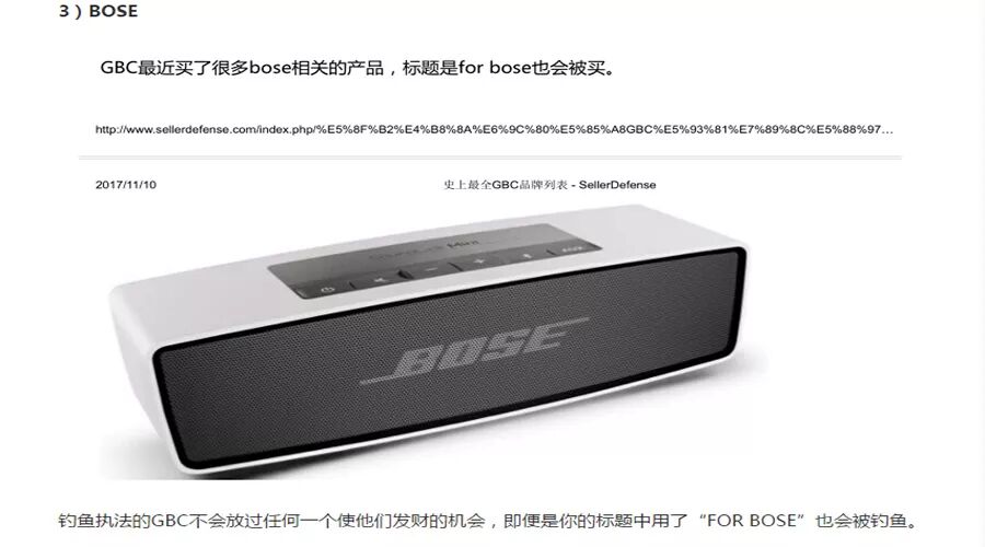 元旦快乐 2018年 方信与你继续同行 今年第一款产品 音响 2018年1月1日, 方信小编在此祝大家: 元旦快乐, 跨境大卖! 请不要问小编为什么今天也上班, 为了你们, 我,无所畏惧! 插播广告: 文末有福利哦,请一定看到最后哦! 18年分析的第一款产品:音响, 一款据说已经被GBC律所盯上的音响。 说到GBC (Greer, Burns & Crain, Ltd),咱们跨境卖家应该十分熟悉了。在国内跨境卖家界,GBC律所被称为流氓律所,擅长钓鱼执法。 (当然,小编对这个说法不予以评论哈!毕竟自己不侵权又怎么会被别人钓鱼呢?) 12月中旬,小编留意到亿恩网上发布了一则关于《总结:中国卖家的这些产品屡遭GBC搞,千万不要碰》的消息,正好前几天,小编遇到一位卖家咨询关于蓝牙音响外观侵权的问题。所以,小编就以被GBC盯上的这款音箱,做一个简单的分析,以帮助卖家避开雷区。 (From ennews.com) 根据亿恩网的消息称,GBC律所购买了含有“BOSE”品牌的相关产品,“FOR BOSE”也有购买,提醒卖家在产品描述时需要注意避开这些词。 BOSE是美国知名的音响制造商,享誉全球。其官网是https://www.bose.com/en_us/index.html (From bose.com) 首先,我们先来看看BOSE在欧美的商标注册情况: 在美国,其品牌名BOSE注册的类别涵括第7、9、12、16、35、37、42类。不仅注册了设计字体商标,在今年九月份追加注册了标准文字商标。可见,BOSE对品牌保护意识之强。BOSE一词,有效商标共有25个,其中大部分都是BOSE公司名下的商标。 (设计字体) (标准字体) 在欧盟,BOSE同样也是申请了标准字体和设计字体商标,类别囊括3、9、16、35、37、41、42大类。 (BOSE欧盟商标) 毫无疑问, Bose公司在欧盟和美国都取得了BOSE的商标注册,如果没有获得Bose公司授权销售,在电商平台上销售含有BOSE字样的音响耳机产品,都属于商标侵权行为。不仅产品上不能印有BOSE的字样,在listing描述中也要避开出现BOSE一词。 亿恩网的新闻也给我们卖家提醒了,GBC律所正在购买含有BOSE关键词的音响产品,如果被GBC律所起诉,那可能就会有点糟心了哦。 商标侵权比较容易避开,专利方面难度会略大一些,稍一不注意就会被投诉外观专利侵权。BOSE作为全美知名的音响耳机研发生产公司,在音响领域称得上是领头羊。因此,BOSE公司对音响耳机的技术发明专利和外观设计专利都有很多。 在美国欧盟,BOSE公司提交的专利达上千件,有发明专利也有外观专利。小编把其中几个外观专利挑选出来,给卖家们参考。 (美国外观专利) (美国外观专利) (美国外观专利) (欧盟外观专利) (欧盟外观专利) (欧盟外观专利) 此外,有卖家跟小编说曾经在亚马逊上看到过有一款便携式蓝牙音响十分畅销,和下图BOSE的产品外外观比较相似,卖家们看图提高警惕哦。 (BOSE其中一款蓝牙音响) 总结: 标题使用“BOSE”品牌, 不行! 产品印上“BOSE”品牌,不行! Listing中使用“BOSE”品牌,不行! 外观设计模仿“BOSE”产品,不行! 目前,消息传出GBC律所针对BOSE关键词产品采取行动,BOSE公司本身也会采取维权行动的,所以销售蓝牙音响和耳机相关的卖家们需要留心了哦!