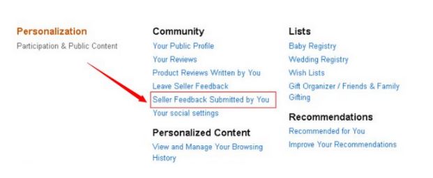(2)在Your account界面下的Personalisation一栏找到Seller Feedback Submitted By You点击进入,如下图所示: