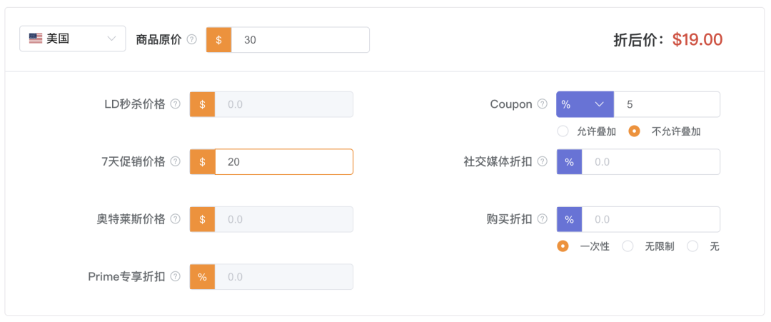 举例:商品原价=$30,参加7天促销,促销价=$20,Coupon=5% → 折后价 = 20 - 20×5% = $19