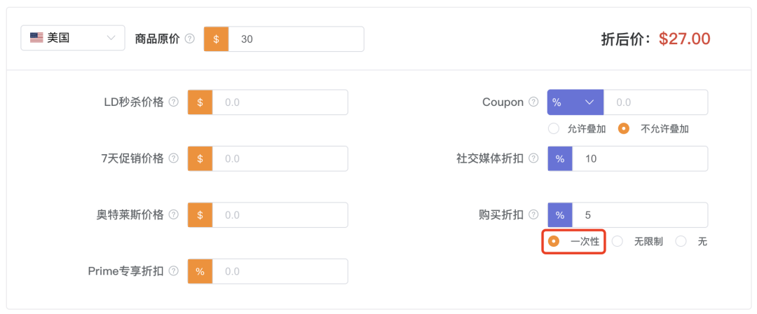 原价$30,社交10%,购买5%(设置为“一次性”) → 折扣取最大值10%,折后价 = $27