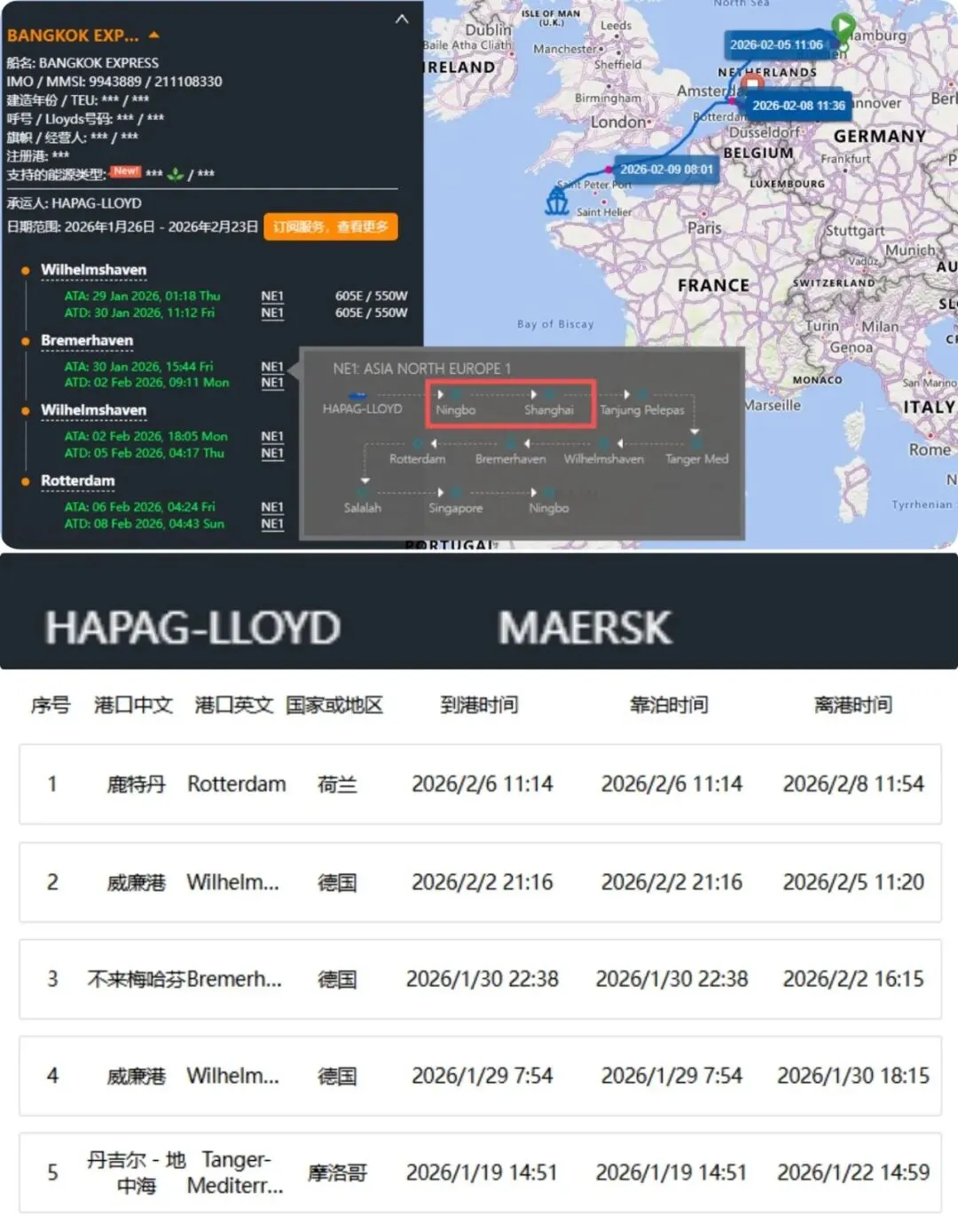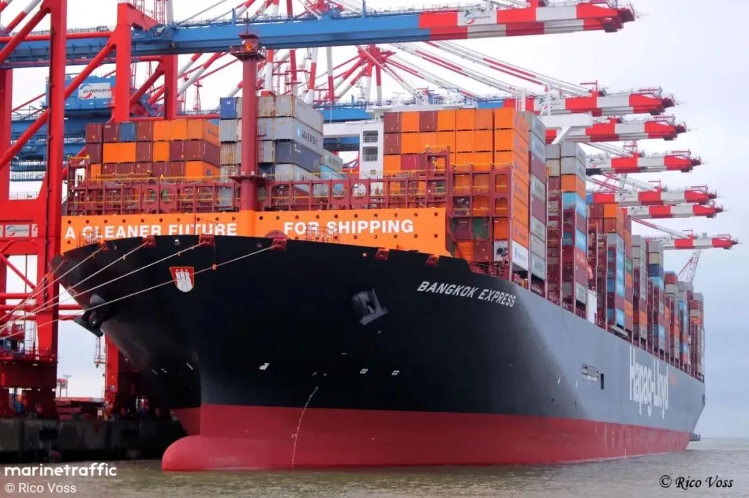 据港口方面通报,涉事集装箱船为“Bangkok Express”号(IMO:9943889),船长约400米,载重吨229,348吨,为赫伯罗特所有并运营,悬挂德国船旗,服务于亚洲—北欧NE1(ASIA NORTH EUROPE 1)航线,事发时正在执行605E航次,曾挂靠国内宁波(12月12-14日)和上海港(12月16-18日)。大船期信息显示,该航线为赫伯罗特与马士基共舱航线。