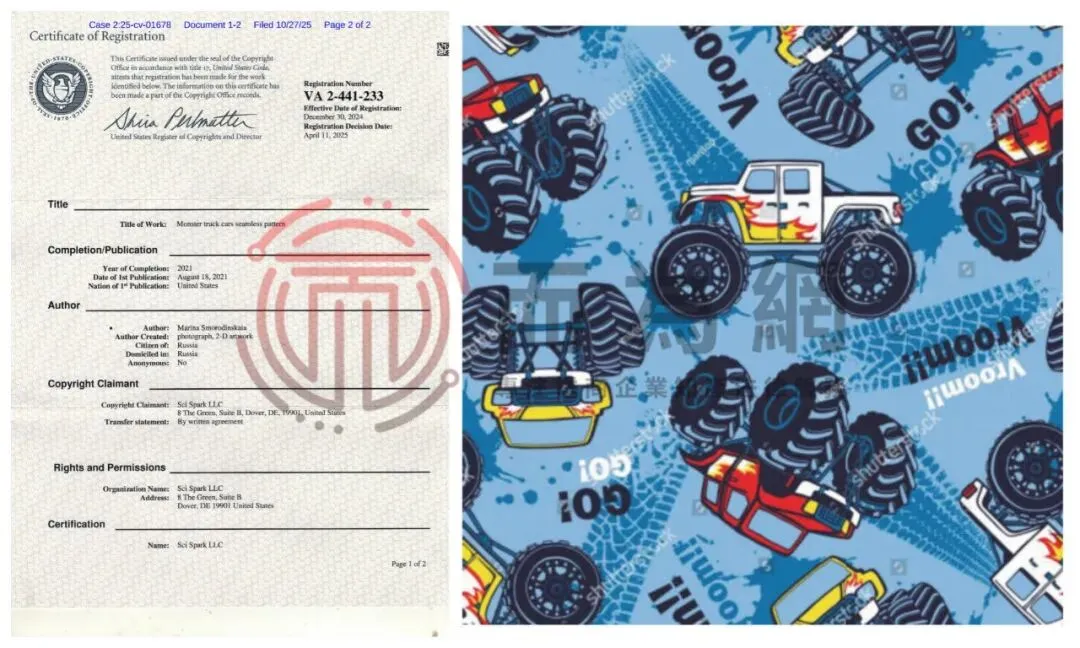 本案涉及的版权信息如下,共1张怪物卡车矢量图,此外,小为排查到原告旗下还有多张版权证书,未经授权都不能擅自使用,请卖家们仔细排查,避免侵权!