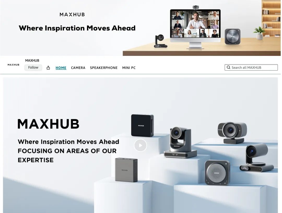 Maxhub的亚马逊品牌店铺,主要销售cemara,speakerphone和mini PC三大产品线。