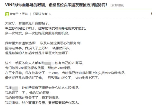卖家曝光某个Vine Voice的无良服务商,他被骗了1W