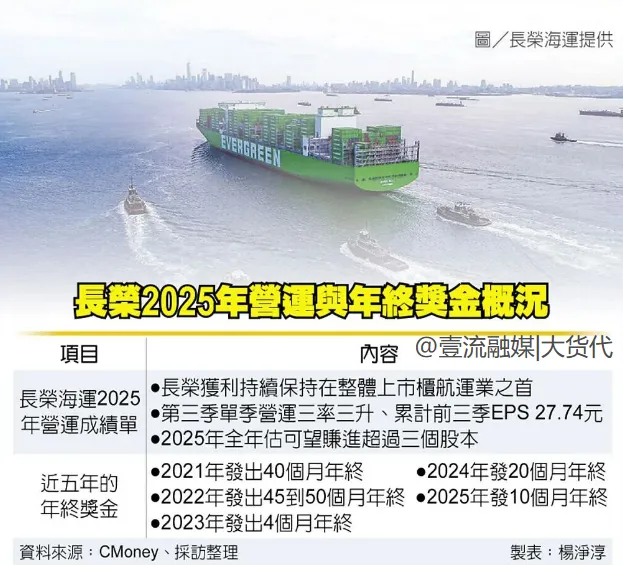 根据台媒报道,中国台湾货柜三雄中的长荣海运已率先公布2025年的年终奖方案——员工平均可获约10个月薪酬的年终奖金!