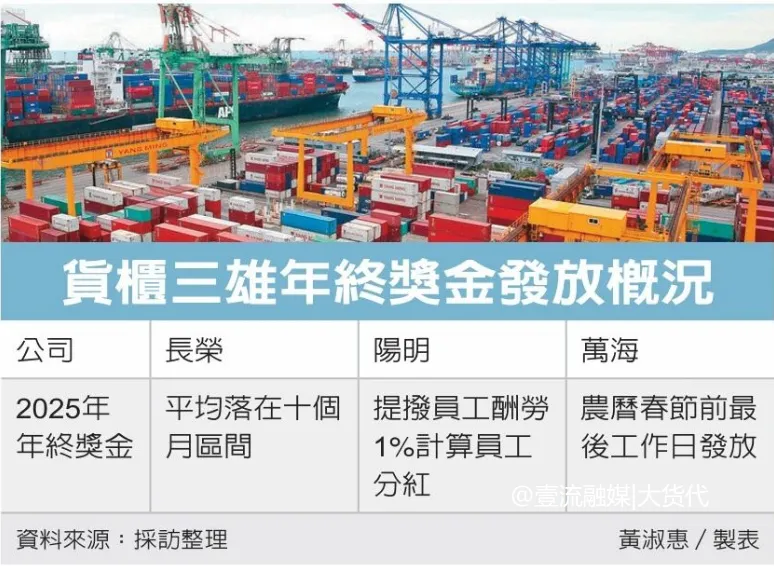 另据台媒报道,同为中国台湾货柜三雄的阳明海运和万海航运也正在准备年终奖,不过具体方案尚未公布。