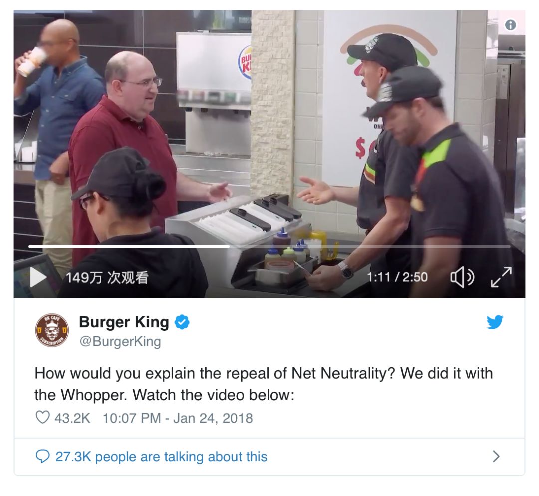 很多品牌在宣传的时候都会避免极具争议性的话题,但汉堡王反其道而行之。他们记录下某种特殊汉堡的延迟售卖活动,让人们更深入的了解网络中立性的存在。最终,这则视频在推特上产生了150万收看量,在YouTube和脸书的的收看量分别为460万和1500万。