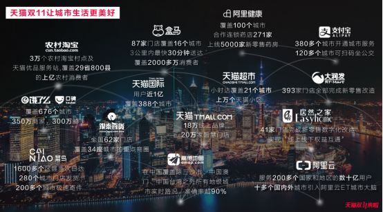 与往年不同的是,阿里生态形成的城市生活“操作系统”,让今年的天猫双11第一次从线上扎根到各个城市,形成线上线下联欢。