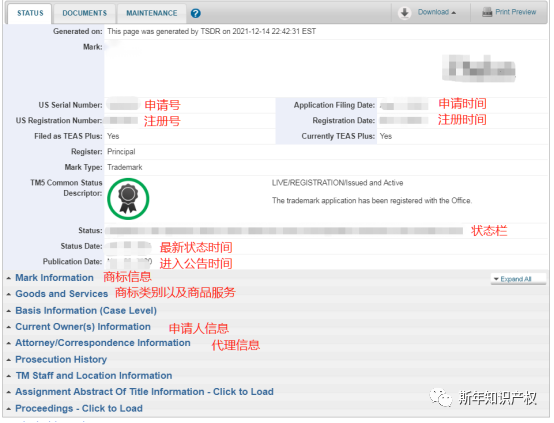 进入后台(TSDR)之后,就有以下的截图所示。其中这一页是状态页(STATUS),基本前台所有的信息在后台都可以查到。这里最需要关注的是Status这一栏,这里可以看到最新的商标进展。如果状态栏显示的是被人提出了异议或者无效的话,需要下拉看Proceedings。 点开可以看到异议或者无效的相关文件。