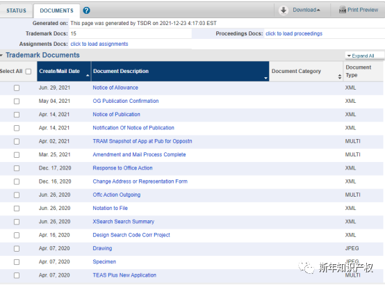 第二页面是文件(DOCUMENTS),所有提交给商标局和商标局下发的文件在这里都可以查到