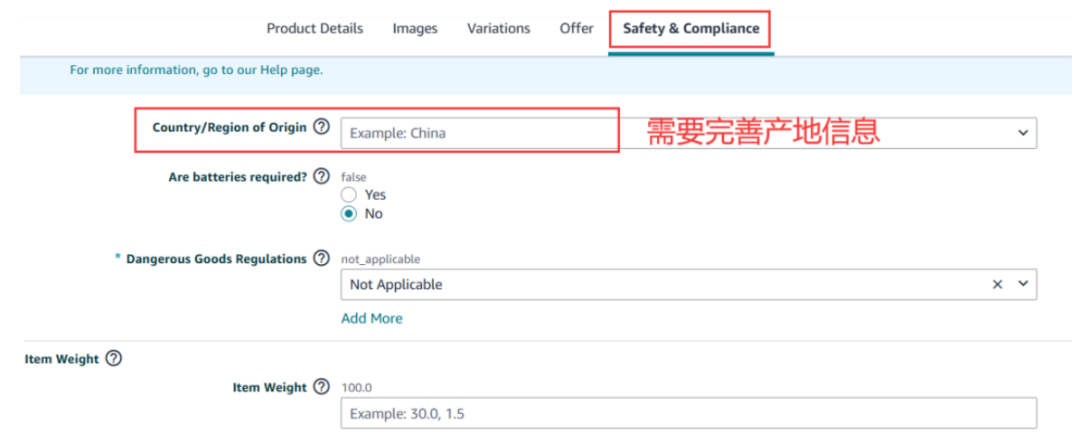 针对新选品:如果您未提供商品的原产国/原产地信息,您将无法成功创建新商品。