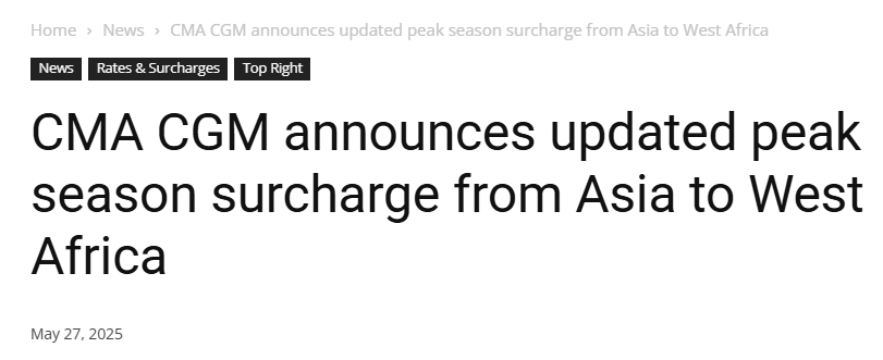自2025年6月7日起,直至另行通知,从中国、中国香港、中国澳门、东北亚、东南亚运输至西非的货物每标准箱征收800美元,适用于干散货,且仅适用于短期合同。