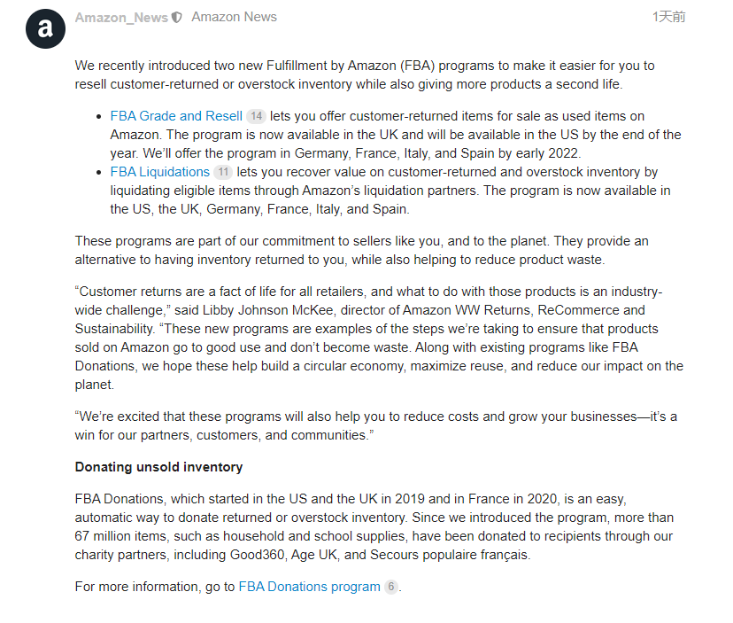 亚马逊表示这些新计划是为了确保在亚马逊上销售的商品得到充分利用、避免浪费而采取的措施,亚马逊希望这些计划有助于建立循环经济、最大限度地利用资源并减少对地球的消耗和影响。旨在帮助卖家重新获得退货、积压商品的价值,同时节省地球资源。