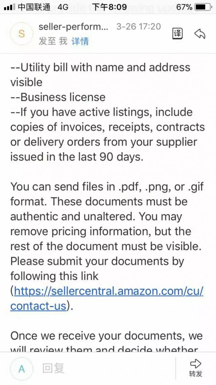 一般收到审查的邮件里头会说明需要你提交的资料,比如下面这位卖家收到的这样的邮件: