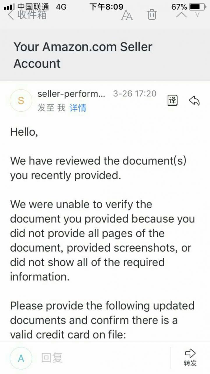 邮件中说无法验证卖家提供的文档,因为文档提供的不够全面没有显示所有需要的信息。还要确认有效的信用卡存档。