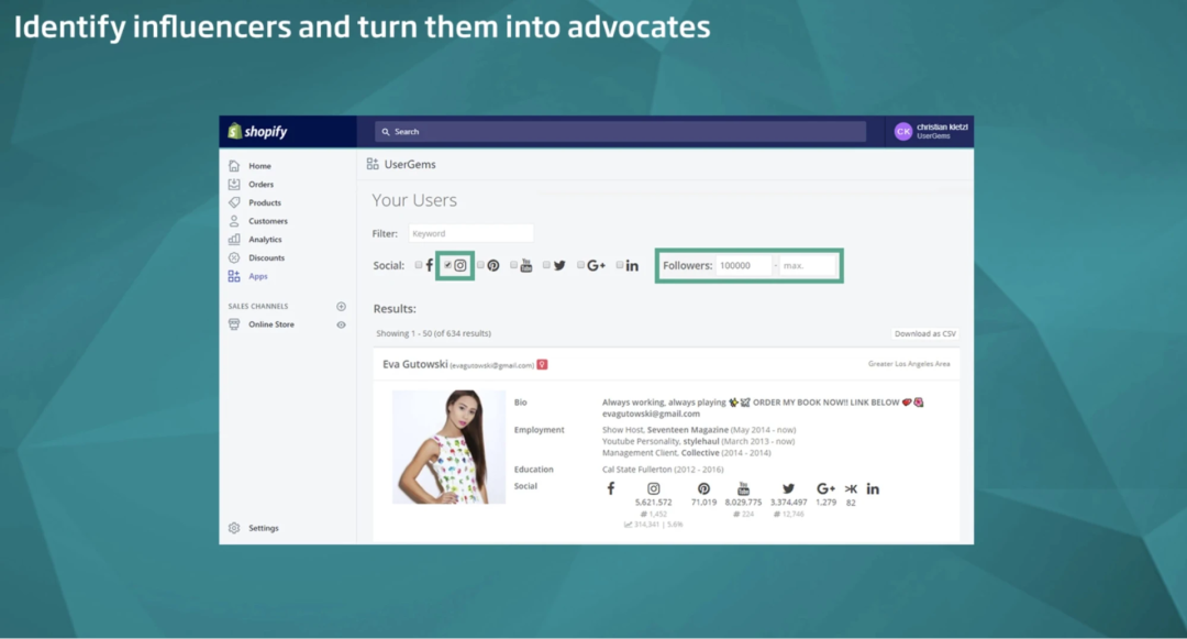 你是否曾经想过,你的某个消费者可能是社交媒体上的一位大人物?你的答案就在 UserGems。这个 Shopify 应用程序会收集关于你的消费者的社交媒体信息,这样你就可以对他们进行分类,从而准确地找到你要寻找的人。
