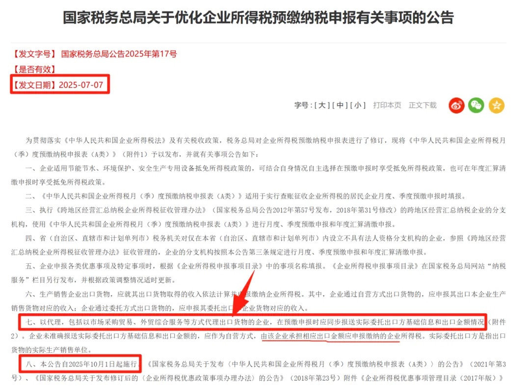 2025年7月7日,国家税务总局发布2025年第17号公告,修订企业所得税预缴纳税申报表,其中第七条对出口业务影响重大,“买单出口”模式终结或将成历史,公告自2025年10月1日起施行。