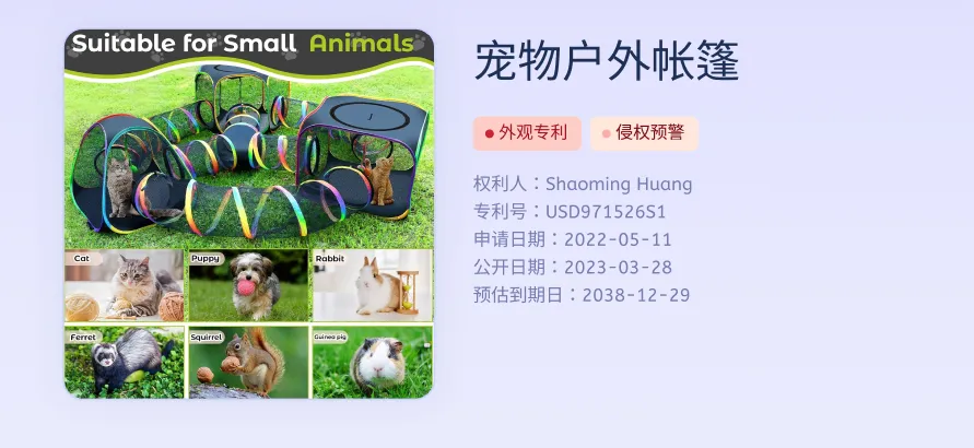 本案原告凭借2 项宠物户外用品外观设计专利,针对爆款组合式宠物帐篷 / 隧道产品发起维权。案号为:26-cv-02454。代理律所为 TRO 案件经验丰富的 Alioth Law ;除此之外,睿观了解到本案原告名下还有大量生效外观专利,请一并排查下架相关产品。