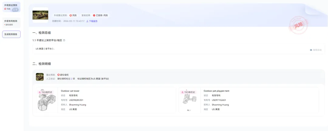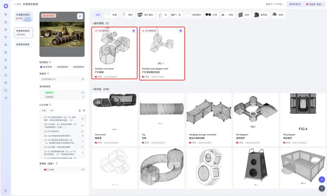将此次发起维权的产品图片上传至睿观外观专利检测功能后发现, 该产品已有生效专利且已有TRO维权史。