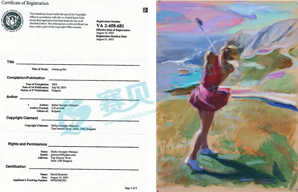 原告此次维权的是一项美国注册版权,登记号为VA 2-458-681的“女性高尔夫球手”插画,版权登记于2025年8月14日,作品完成并首次发表于2019 年, 其创作风格属于具象表现主义:既保留了 “女性挥杆” 的清晰具象主体,又融入了表现主义的艺术处理。赛贝提醒跨境卖家,未经授权不得擅自使用,以免引发侵权风险。