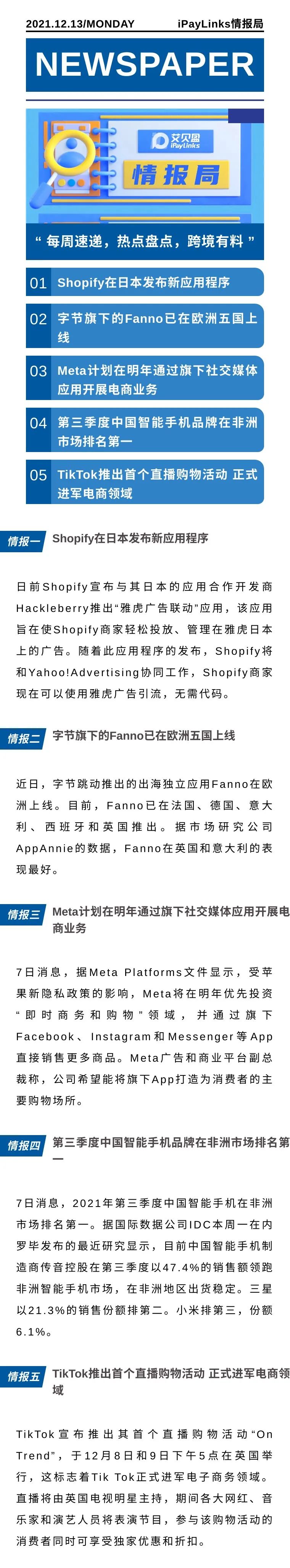 Shopify在日本发布新应用程序;字节旗下Fanno已在欧洲五国上线;第三季度中国智能手机品牌在非洲市场排名第一…|跨境情报局