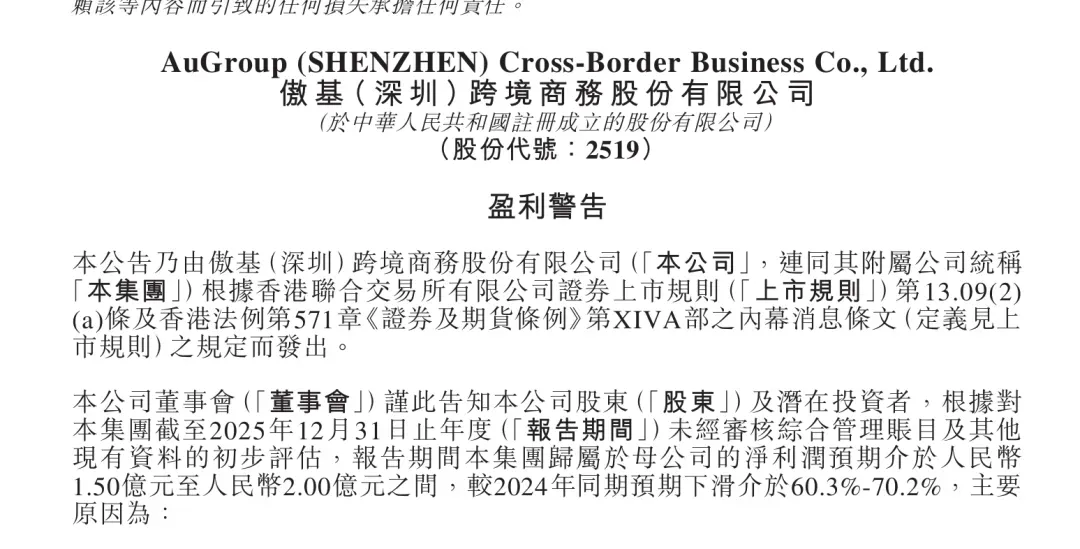 近日,傲基发布公告称,预计2025年归母净利润为1.5亿至2亿元,相比2024年同期的5.04亿元将大幅下滑60.3%—70.2%。