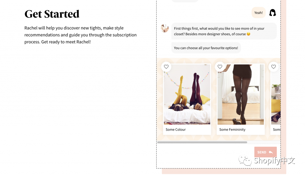 Rachel采用的是一种基于客服聊天的AI顾问方式。通过在页面内预设的问题,让客户选择出心仪的产品类型,帮助客户订阅购买。
