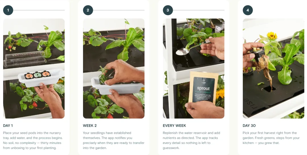 为了解决这些问题,Rise Gardens通过标准化和自动化相结合的方式,大大简化了使用流程。其将整个种植过程拆解为“清晰的四个步骤”,每个步骤都对应着固定的时间节点和简单的操作动作。同时,设备配备了全光谱LED生长灯、专利重力灌溉系统、大容量水箱和语音控制功能。