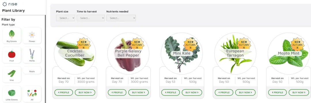 为此,Rise Gardens建立了一个完整的植物数据库,详细记录了预计收获时间、单次产量、营养成分和生长阶段等信息,用户可以根据自身需求筛选出最合适的品种。