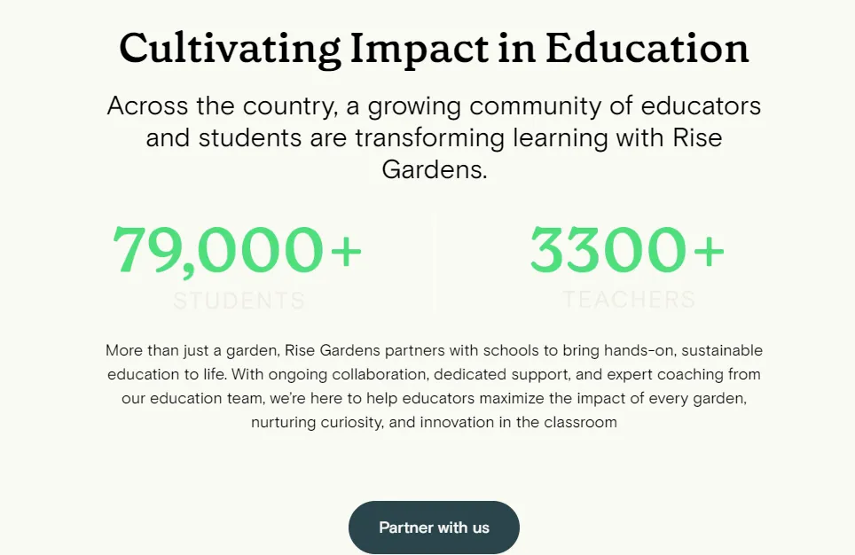除了作为日常食材生产工具,Rise Gardens还通过与学校、教育机构的合作,将智能园艺设备定位为跨学科的学习工具。品牌与教育机构合作,推广智能花园作为自然科学教育的工具,让学生在种植过程中学习生物学、化学和工程学等知识。