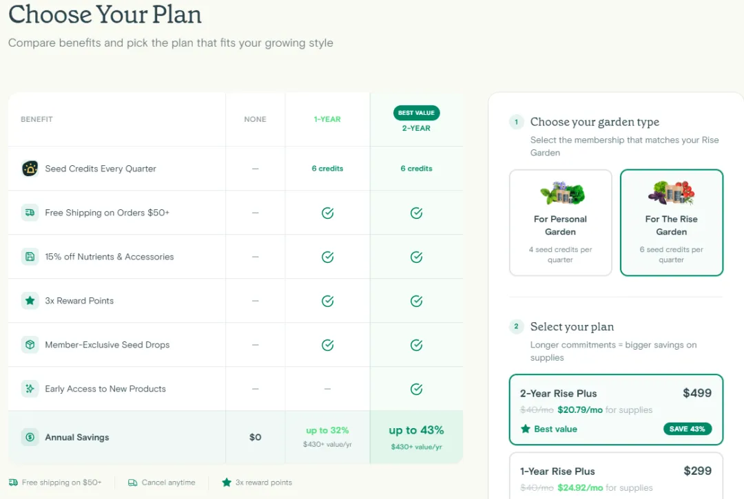 为了有效缓解这一心理障碍,Rise Gardens通过推出会员服务来强化“长期省钱”的价值感。每季度,会员可以获得种子积分,这些积分可以兑换种子包装或营养液,并且享受50美元以上免运费等额外权益。